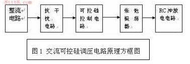 1. 可控硅(晶閘管)交流調(diào)壓電路的原理方框圖如圖1所示 (1)整流電路采用橋式整流,將220伏,50赫茲交流電壓變?yōu)槊}動直流電。 (2)抗干擾電路為普通電源抗干擾電路。 (3)可控硅控制電路采用可控硅和降壓電阻組成。 (4)張弛振蕩器由單結(jié)晶體管和電阻組成。 (5)沖放電電路有電阻和可變電阻及電容組成。